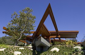 A cantilevered "sun catcher," a steel beam wrapped in wood, extends beyond the walls of the house. Architect Norm Applebaum spent eight years working on the 54,000-square-foot design, which required California Coastal Commission approval. |