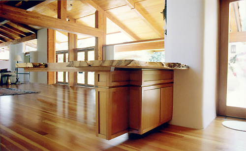 The 3-inch thick slab seems to defy gravity as it cantilevers off its steel base, designed by the architect.